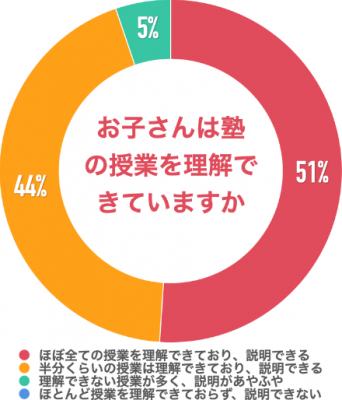 「ほぼ全ての授業を理解できており、説明できる」が51%、「半分くらいの授業は理解できており、説明できる」が44%、「理解できない授業が多く、説明があやふや」が5%、「ほとんど授業を理解できておらず、説明できない」が0%でした。