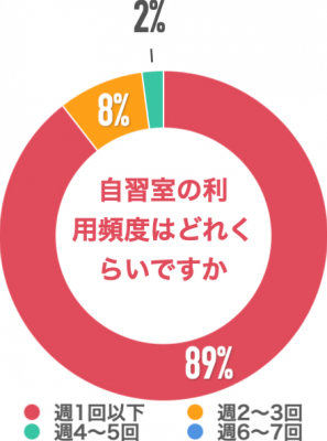 「自習室の利用頻度はどれくらいですか」についてたずねたところ、「週1回以下」が89%、「週2〜3回」が8%、「週4〜5回」が2%、「週6〜7回」が0%と続きました。