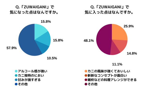結果、気に入ったポイントとして、(1)カニの風味が強くておいしい(2)斬新なコンセプトが面白い(3)雑炊などの料理アレンジができる、気になったポイントとして、(1)アルコール感が強い(2)カニの独特のにおい(3)甘みが強すぎるなどの回答を得ました。