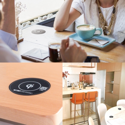 Qi充電モジュールのトップカバーには、耐久性と防水性を備えた業界最薄0.5mm厚の樹脂ステッカーを採用し、食器やグラス配置の邪魔にならないので飲食店にも最適です。