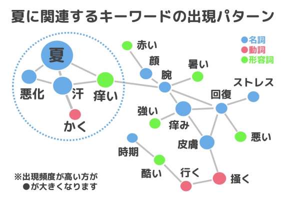 アトピヨが実施した「夏」に関連するユーザーコメント調査では、夏は「汗」によって、痒くなったり、アトピーが悪化していることが読みとれました。さらに、キーワードの出現パターンからは、夏はイベントやレジャーへの外出が増える時期ではあるものの、顔が赤くなったり、痒みが強くなったり、症状が酷くなって掻いてしまい、ストレスを抱えていることも伺えます。