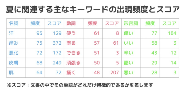 ユーザーコメントからも「このくらいの季節になると、いつも痒みがでる。 赤くなって、汗をかくと悪化する。夏が恐ろしい」「夏、汗とかで痒くなっちゃうのでお互い頑張りましょ」「夏場なので、汗はきちんと拭き取って清潔にですね」と夏の「汗」に苦労しながらも対処していることが分かります。