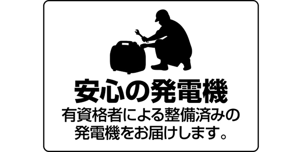 多くの操作説明や修理のお問合せをいただきました。万一を想定し10万円を超える発電機を購入していただいたものの、発生する多くの問題はこの2つです。そこで、現実に即したプランを模索し構築したのが「災害時発電機レンタルプラン」です。貸し出される発電機は弊社技術スタッフにより点検整備・始動確認され、会員の皆様に届けられます。個人様も団体様も安心して利用できる発電機レンタルサービスです。