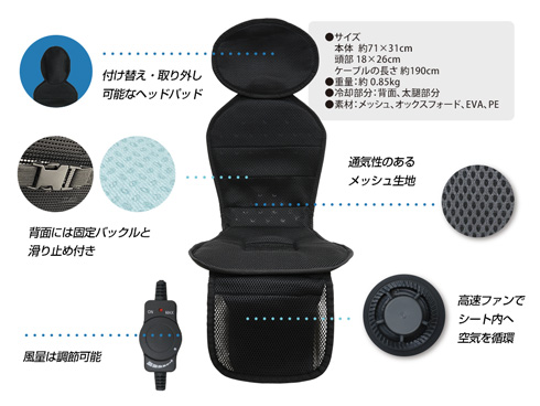 太もも部分にあるファンから風を取り込み、シート内を循環して、お尻から背中にかけて風が送られる仕組みになっています。外気を取り込むため、エアコンなどの冷たい空気を送ることでさらに効果を発揮します。シートには通気性の良いメッシュ素材を使用しているため、効率よくファンからシート内へ風が行き渡ります。