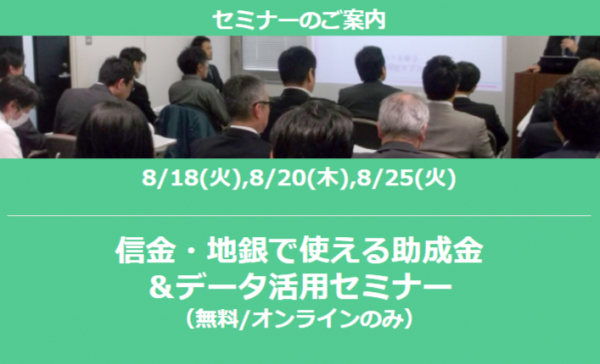 「信金・地銀で使える助成金&データ活用セミナー」8/18(火),8/20(木),8/25(火)開催【60分/無料/全国/オンラインのみ】のお知らせ
