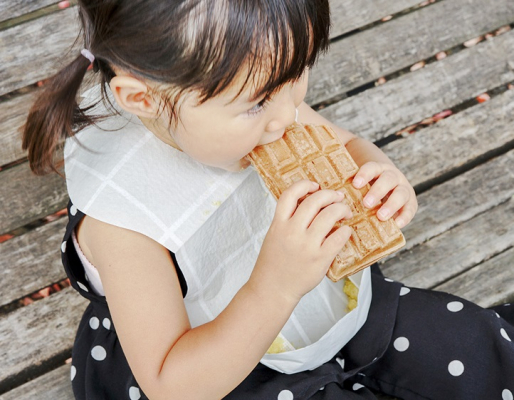 食べこぼし・飲みこぼしキャッチポケットが付いており、テーブルや衣服が汚れにくくなっています。また、生地は三層構造で、裏面には防水加工がされており、飲み物や離乳食をこぼしても染みこみにくくなっています。