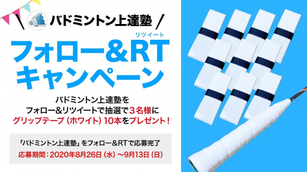 株式会社Real Style(本社:奈良県大和高田市、代表取締役:鍵谷 健、以下 当社)は、2020年8月26日(水)〜2020年9月13日(日)まで、当社が運営するバドミントン上達塾 公式Twitter及び、Facebookアカウント(@badminton_rs)のフォロー&リツイート(いいね!)キャンペーンを実施しています。