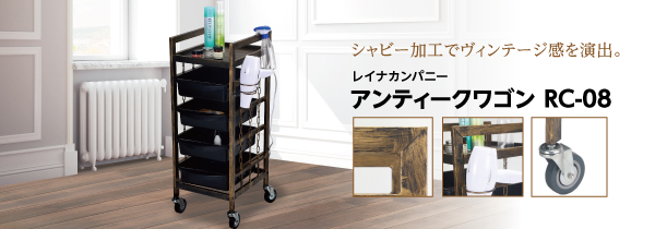 「アンティークワゴン RC-08」は、人気のシャビーテイストを取り入れた存在感抜群のワゴン。アイアンフレームや天板に、アンティーク風の質感を出すために、重ね塗りや擦れなどの加工を丁寧に施しています。細部にもアイアンのスプリングとチェーンが施され、アート感のあるインダストリアルな雰囲気をさらに演出。クールな存在感で、こだわりのあるサロン様の空間作りや雰囲気を一層引き立てくれるはずです。