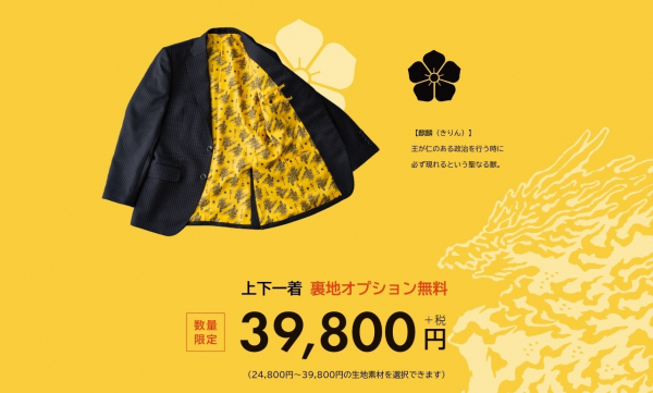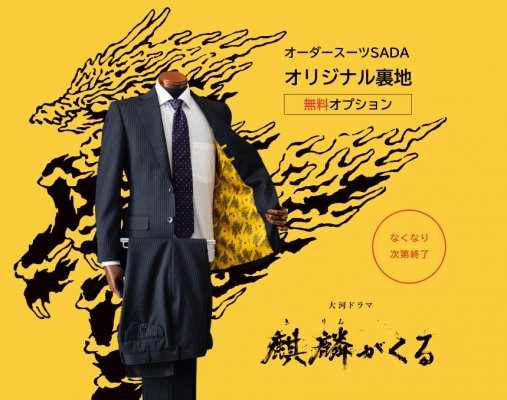 〜『麒麟がくる』タイトルロゴ使用のデザイン裏地スーツが「オーダースーツSADA」から登場〜