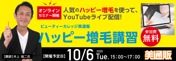 プロ向け美容材料の通信販売サイト「美通販」が、「ビューティーカレッジ美通販 増毛エクステンション 無料オンラインセミナー」を開催いたします。人気の「ハッピー増毛」を使って、YouTubeにてライブ配信を行います。配信予定日時は、2020年10月6日(火)15:00〜17:00。参加費は無料ですので、この機会にたくさんの方々にご参加いただきたい所存です。