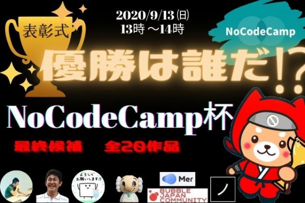 合同会社NoCodeCampは、プログラミングをせずにWebサイトやアプリを開発する【NoCode(ノーコード)】を専門に扱った日本初のオンラインサロン【NoCodeCamp】にて企画された、学生限定のWebサービス作成コンペティション「NoCodeCamp杯」の結果発表イベントを2020年9月13日13:00より開催。