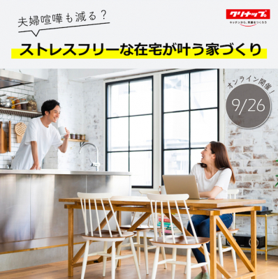 クリナップ(本社:東京都荒川区 代表取締役 社長執行役員:竹内 宏)は、『夫婦喧嘩も減る?ストレスフリーな在宅が叶う家づくり 〜秋のリフォームまつり〜』と題し、おうち時間を快適に過ごすアイデア満載のオンラインセミナーを、9月26日(土)に開催いたします。