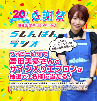 らしんばんTwitterにて20周年大感謝祭のツイートを投稿。そのツイートをリツイートおよびアカウントをフォローしていただいた方の中から抽選で、1名様に富田美憂さんが着用したエプロンをプレゼント!