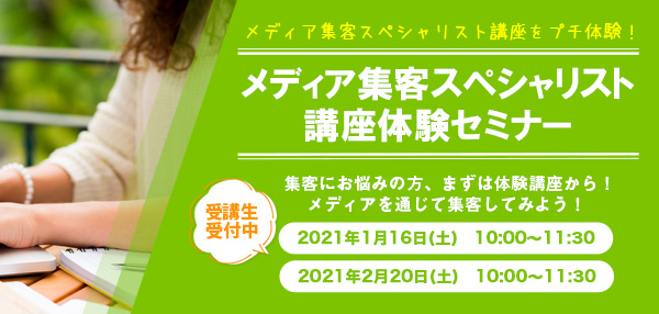 メディアの基礎/メディア集客スペシャリスト講座をプチ体験/成功事例紹介/講座のカリキュラム紹介