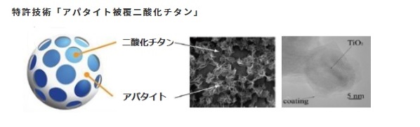 2009年 (独)科学技術振興機構と(独)産業技術総合研究所により共同開発され、実用化に成功したものです。二酸化チタンの表面にアパタイトをマスクメロンのようにコーティングする(=被覆する)ことで、アパタイトの特性である吸着力が大気中に漂っている細菌や有機化合物などを吸着するため、より効率よく細菌や有機化合物を・除去できるようになります。