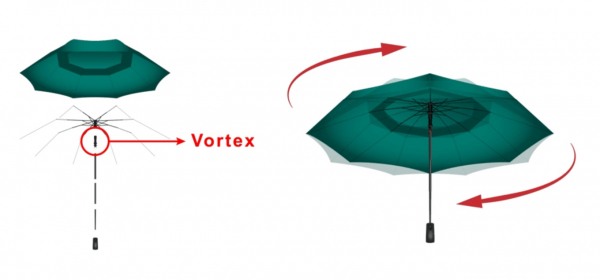 それを解決するのが、「Vortexテクノロジー」です。傘布パーツが360度回転することで、傘が衝突しても回避することが可能となります。傘がぶつかる不快感も軽減できるといったメリットがあります。