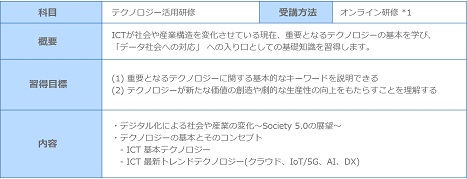 DX人材に必要なテクノロジー、データ活用とビジネスプロセス可視化のポイントを3時間で修得するコースです。受講者は月2回、学習で不明な箇所をインストラクターにオンラインで質問できるセッションに参加できます。