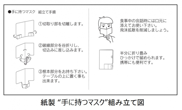 “手に持つマスク”は、厚紙をガイドに沿って組み立てることで、簡単に作ることができる使い捨てのガードです。飲食時にマスクの耳掛けを着脱する面倒なく口元を覆うことができ、食事中の会話による飛沫の防止も期待できます。