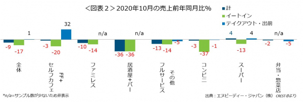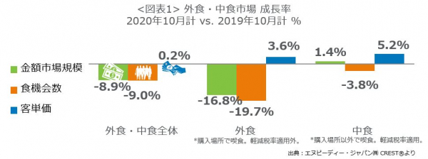 エヌピーディー・ジャパン、最新外食・中食レポート「2020年10月の市場動向、外食・中食売上は8.9%減、外食の回復が進む、出前は38%増」を公表