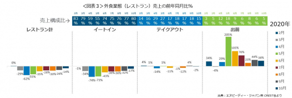 外食業態計(レストラン計)の売上前年同月比を利用形態ごとにみてみると(図表3)、出前の大幅増が続いていて、4月は29%増、5月は205%増、6月は105%増、7月は76%増、8月は23%増、9月は44%増、そして10月は38%増で2桁成長となりました。また、外食業態のイートインは17%減で、回復が低迷していた7-9月と比べ大きく回復しました。