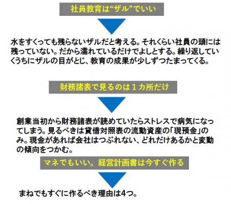 介護業界で右肩上がりの成長を続ける会社経営者による経営入門書。「教育をしても社員は聞いていない。“ザル”だと思うこと」「経営計画書はまねをしてつくる」「資金繰りが苦しくてもニコニコしていれば銀行はお金を貸してくれる」など、一見“非常識”な教えが並びますが、いずれも著者が実践し、また若手経営者にアドバイスを行い、成果をあげてきたものばかり。経験の浅い経営者、これから起業する人に役立つ36のポイントを解説。