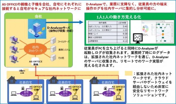 コロナ環境下では、中小規模の企業においてもリモートワークの本格検討が待ったなしとなっております。しかし、導入に際しては従来型のSSL/VPN方式や画面転送方式など数々の技術方式の検討に加え、ネットワーク機器設定変更や従業員端末への設定、操作マニュアル作成、利用方法の従業員への説明など多くの課題があります。また企業の経営者の方は従業員がリモート環境で本当に効率的に働けているのか分からないという課題を抱えています。今回のAS OFFICEとD-Analyzerの連携では、これらの課題を解決し、さらに中小規模の企業のシステム部や情報システム部の従業員リソースが不足しているお客様先であっても、リモートワークを可能とするネットワーク環境構築と、リモートワークでの従業員の業務可視化を実現します。