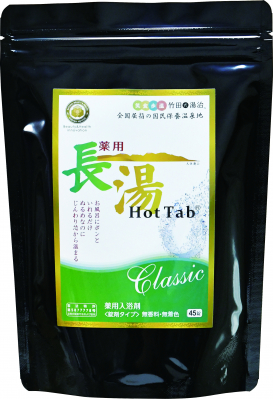 薬用長湯ホットタブ Classicは、当社が独自技術で開発した、家庭で重炭酸温浴を楽しめる入浴剤『ホットタブ』をベースに、さらなる温浴効果の向上を追及し長湯温泉のある竹田市と共同開発した製品です。塩素を中和し、香料も着色料も一切含まないためご家族皆さまでご利用いただけます。