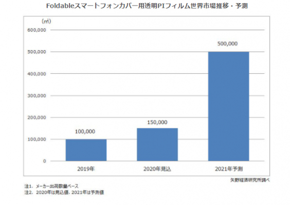 【矢野経済研究所プレスリリース】Foldableスマートフォンカバー用透明PIフィルム世界市場に関する調査を実施(2020年)〜2020年世界出荷量は前年比150%の15万平方メートルの見込〜