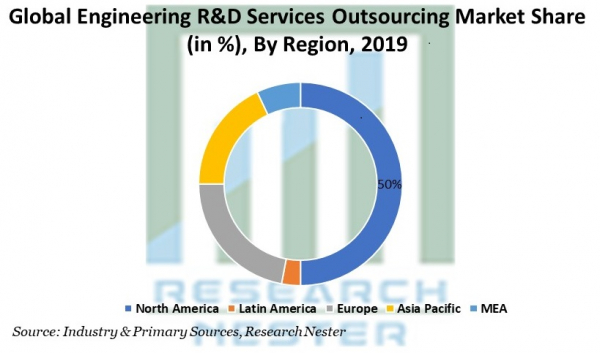 北米の市場は、2019年に約50%の最大の市場シェアを保持しました。この地域の市場は、他の地域のプレーヤーが戦略的提携をますます試みている地域に多数の企業が存在するため、さらに大幅に成長すると予想されます。北米におけるエンジニアリングR&Dサービスのアウトソーシング市場は、最速の市場と見なされています。
