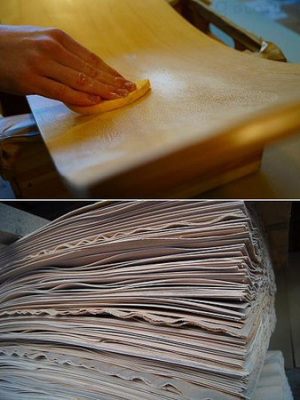 作り方は違いますが、今も職人さんが心を込めて一つ一つ作っています。下の写真は、ブナの木をスライスしたものです。ドイツ国内で大きくて質の良い木を厳選して原材料としています。