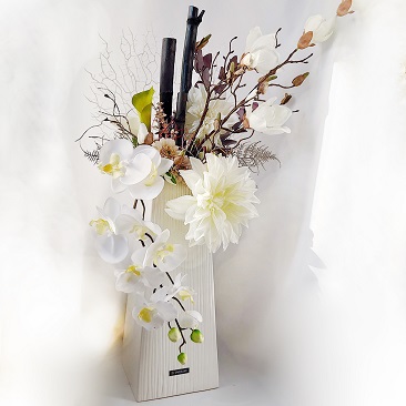 日本の貴重な竹炭、アーティフィシャル・フラワー、水引きを合わせたインテリアです。マグノリア(モクレン)の花言葉である、「崇高」、「持続性」、「自然への愛」、「前途洋々」など、それぞれのお祝いに合った花言葉を添えることができます。