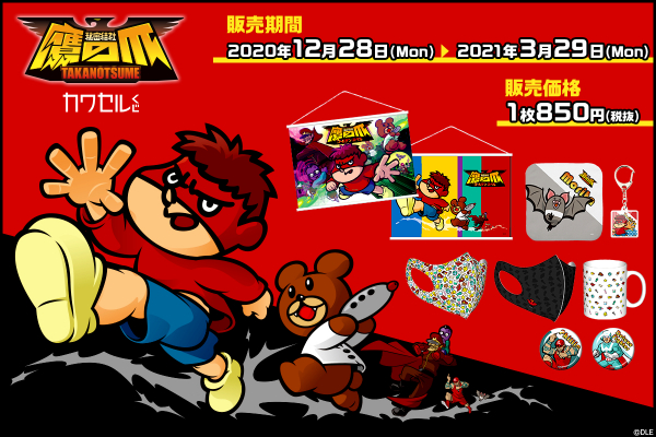 アニメ『秘密結社 鷹の爪 〜ゴールデン・スペル〜』も話題の「秘密結社 鷹の爪」がはずれ無しのオンラインくじ「カワセルくじ」に大好評につき再び登場です!今回はS賞にB2サイズの大型のタペストリー、またA賞は一辺45cmの大きなクッションにキャラクターを全面にデザインしました。またB賞にはこのご時世にぴったりのマスク、C賞以降も普段使いしやすいハンカチタオルやコースターなど充実のラインナップ!さらに缶バッジにはシークレットも登場!はずれ無しの「カワセルくじ」だからこそ出来る、すべてが楽しいグッズとなっています。