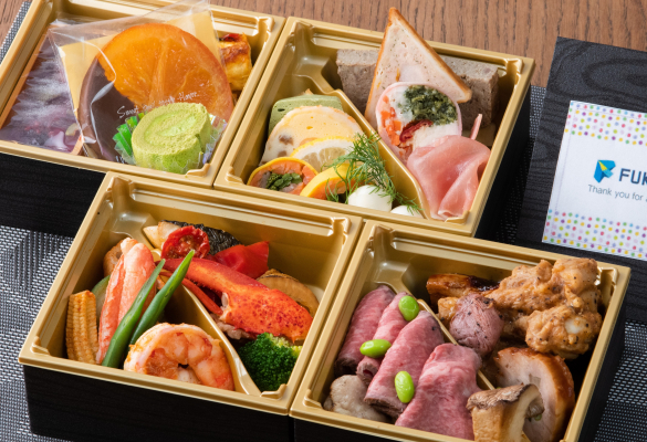 こちらのプランは現在販売中のプランより、1段多い4段のお料理BOXとなっています。当社運営ホテルのシェフが腕によりをかけ、和牛モモ肉のローストビーフや、蟹爪のマリネなど、高品質な食材を贅沢に使用したメニューを詰め込みました。