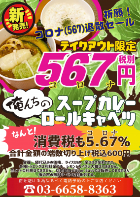 正直、崖っぷちの当店ではありますが、悪あがきといわれようとスープカレーを通して今こそお客様に感謝の気持ちをいつもにも増してお伝えしなければならない、そして共にコロナに打ち勝とうという気持ちをこめて価格も567円(税別)、消費税も5.67%しかお預かりしないという設定にしました。