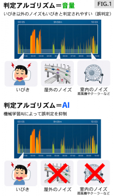 睡眠中のいびきが計測できる「熟睡アラーム」では、これまで「音量」アルゴリズムによるいびき判定を行っていましたが、今回、「AI」のアルゴリズムを新たに追加しました。音量アルゴリズムは、いびき以外のノイズもいびきとして判定(誤判定)する傾向がありましたが、AIアルゴリズムはこの誤判定を大きく軽減します。