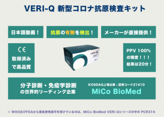 MiCo BioMed(KOSDAQ市場:214610)の日本法人である「Mico BioMed Japan」が販売する「VERI-Q 新型コロナウィルス抗原検査キット」は連日多くの企業様・施設様からのお問い合わせ受け、2021年1月29日より新型コロナウイルス感染症緊急事態宣言の終了までの間、土日も含む24時間チャットやメールサポートを行うこととなりました。
