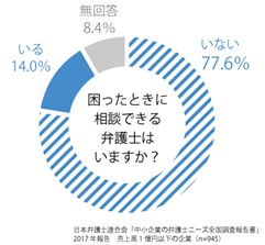 下表のとおり、中小企業には困ったときに相談できる弁護士がいる企業は14%しかありません。個人向けの弁護士保険 『ミカタ』の発売当初より、中小企業や個人事業主から「事業に関連するトラブルにも対応した弁護士保険を作って欲しい」という声がありました。新型コロナウイルスの感染拡大にともない、事業継続リスクへの危機意識がますます高まった、2020年9月16日より『事業者のミカタ』の販売を開始しました。事業を取り巻くトラブルとしては、「債権・売掛金回収、雇用・労務トラブル、オフィス賃貸借に関するトラブル、役員に対する責任追及、知的財産権の侵害、商取引や契約に関するトラブル、商品や製品トラブル、クレーマー対策、インターネット関連トラブルなど」が挙げられます。