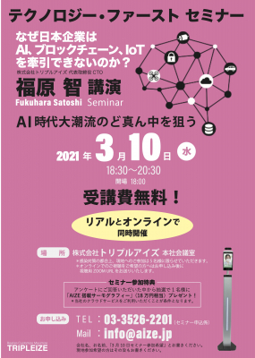 2021年3月10日(水)、株式会社トリプルアイズ(本社:東京都千代田区 代表者:福原 智 以下、トリプルアイズ)は、代表・福原智を講師として「テクノロジー・ファーストセミナー AI時代大潮流のど真ん中を狙う」と題し、経営者・DX 担当者向けの無料セミナーをリアルとオンラインで同時開催いたします。