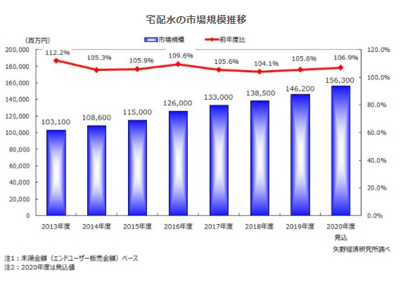 2019年度の宅配水市場規模は、末端金額(エンドユーザー販売金額)ベースで前年度比105.6%の1,462億円と市場拡大が続いている。新規顧客の獲得ペースは以前ほどの勢いはないものの、上位企業を中心に着実に販売本数を伸ばしていることが拡大に繋がった。