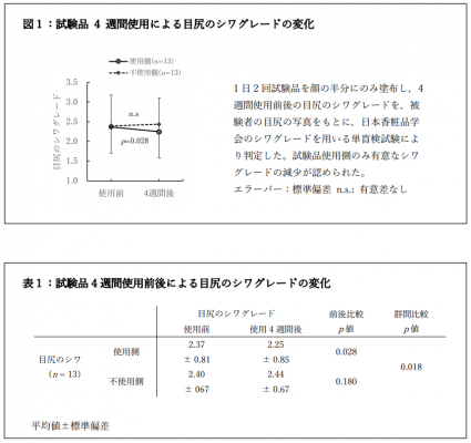 臨床試験4週間後における試験品使用側と不使用側の目尻のシワの変化についてそれぞれ解析したところ,試験品使用側でのみ有意なシワグレードの減少(p = 0.028)が観測されました(図1、表1)。また,使用側と不使用側のシワの変化について,群間比較を行ったところ,p =0.018と非常に高い有意差をもって使用側におけるシワグレードの改善が示唆されました。
