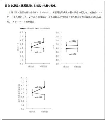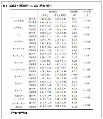 試験品による,シワ軽減以外にも,肌の状態に与える影響を調べるために,検査4週間前後における肌のコンディションについて,被験者にアンケートを行いました。試験品使用側の肌に関して,「潤い」「かさつき」「柔らかさ」「つや」「なめらかさ」「キメ」「化粧のり」「ハリ」「透明感」「洗顔後のつっぱり感」「明るさ」「総合的な肌の満足感」の12もの項目でp < 0.01の高い有意差で改善が認められました(図2,表2)。