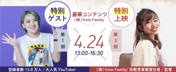 教育事業、恋愛事業、結婚事業を展開する、株式会社 from Family(フロムファミリー)(代表取締役社長:高野龍一 / 所在地:東京都練馬区)は、2020年4月24日に「セックスって何のためにするの?」をテーマとするオンラインイベントを開催します。Youtubeチャンネル登録者数14.2万人の助産師Youtuberシオリーヌさんを特別ゲストにトークショーイベントをおこない、その後第2部として弊社制作映画『SEX裁判』のオンライン上映会を実施します。