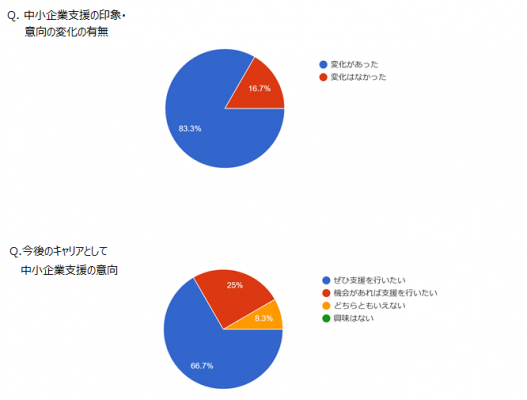 大手企業の参加者アンケートでは、8割以上が中小企業支援の印象・意識の変化があったと回答。今後のキャリアとして、約9割が中小企業支援を行いたい(「ぜひ支援を行いたい」と「機会があれば支援を行いたい」の合計)との結果がみられました。