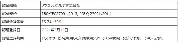アクセラテクノロジ株式会社(本社:東京都渋谷区、代表取締役:進藤 達也)は、2021年2月12日付で、情報セキュリティマネジメントシステム(ISMS)の国際規格である「ISO/IEC27001」の認証を取得したことをお知らせします。