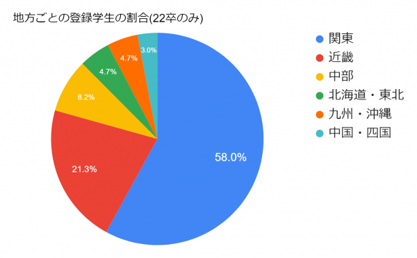 都道府県ごとの登録学生の傾向は、1位が「東京都」の27%、2位が「神奈川県」、「大阪府」と続いており、その後も関東・近畿の府県が続いています。地方ごとの割合は、「関東」が58%で1位、次いで「近畿」が21%と、およそ8割の学生が関東・近畿地方在住の学生となっています。