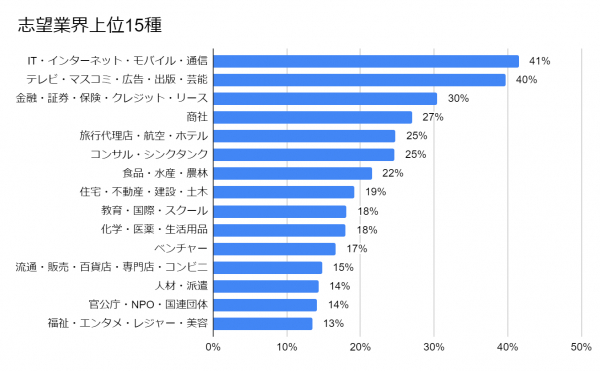 志望業界は「IT・インターネット・モバイル・通信」業界が41%の支持で1位となりました。40%の支持と、僅差で2位となった「テレビ・マスコミ・広告・出版・芸能」業界、その次に「金融・証券・保険・クレジット・リース」、「商社」業界が続いています。