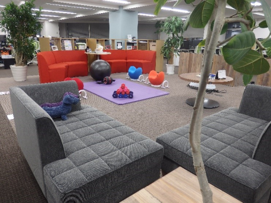 本社内に、自由に利用できる「健康広場」を設置いたしました。業務上、座位の時間が中心となる従業員が多数のため、ストレッチのできるヨガマットや、ぶら下がり健康器、振動マシン、バランスボール、腹筋ローラーなどを設置し、誰もが業務の合間に身体を動かしてリフレッシュできる空間となっています。
