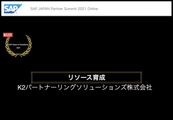 K2 パートナーリングソリューションズ株式会社(本社:英国、代表取締役:安藤チェンダ、以下K2)が、3月5日にオンライン開催されたSAP社主催のコンベンション「2021 SAP Partner Summit Day」において、『SAP AWARD OF EXCELLENCE 2021』のリソース育成特別賞を受賞いたしました。