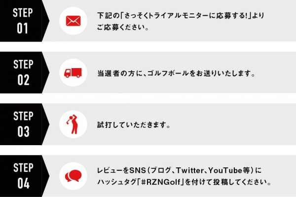 「ゴルフの上達を目指す方に、最高クラスのボールをお求めやすく」を掲げているRZN Golfは、より多くの方々にRZN Golfのゴルフボールをお楽しみいただくために、今回トライアルモニターのキャンペーンとして、SNSや動画等でPRいただける方を60名限定で募集いたします。