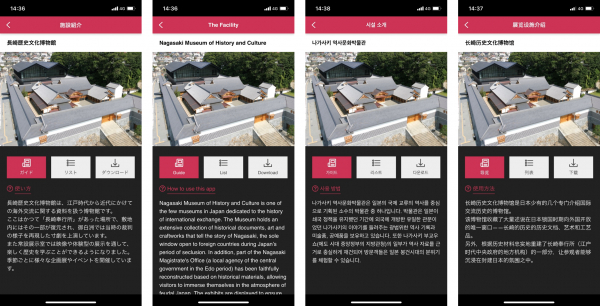 常設展示室や復元された奉行所展示室について、コーナーごとに案内する内容になっており、日本語・英語・中国語・韓国語の4カ国語に対応しています(一部解説は、日本語と英語のみ対応)。